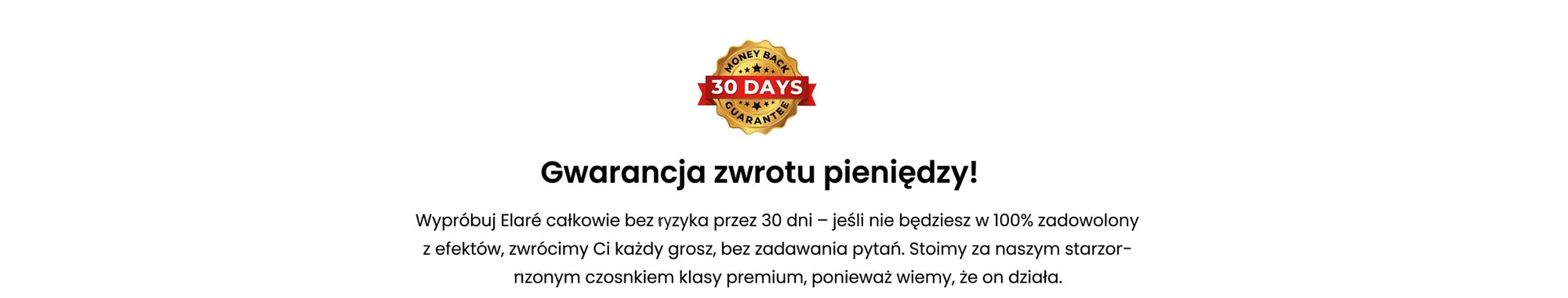 Oferujemy 30-dniową gwarancję zwrotu pieniędzy, ponieważ jesteśmy przekonani o skuteczności naszego czosnku dojrzewającego przez 24 miesiące. Jeśli w ciągu 30 dni nie zauważysz poprawy w zakresie energii, samopoczucia lub wskaźników sercowo-naczyniowych, po prostu odeślij butelki (nawet puste), a otrzymasz pełny zwrot kosztów. Bez zbędnych pytań.
