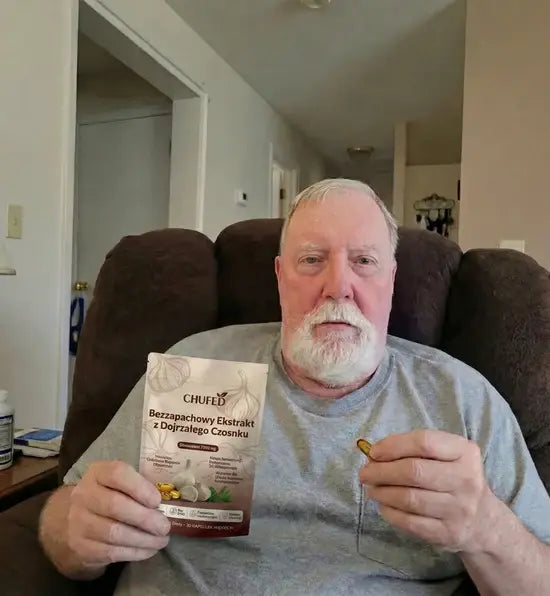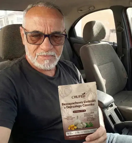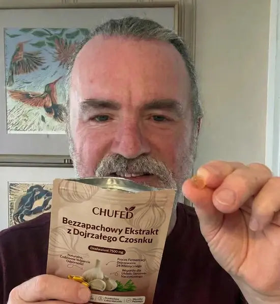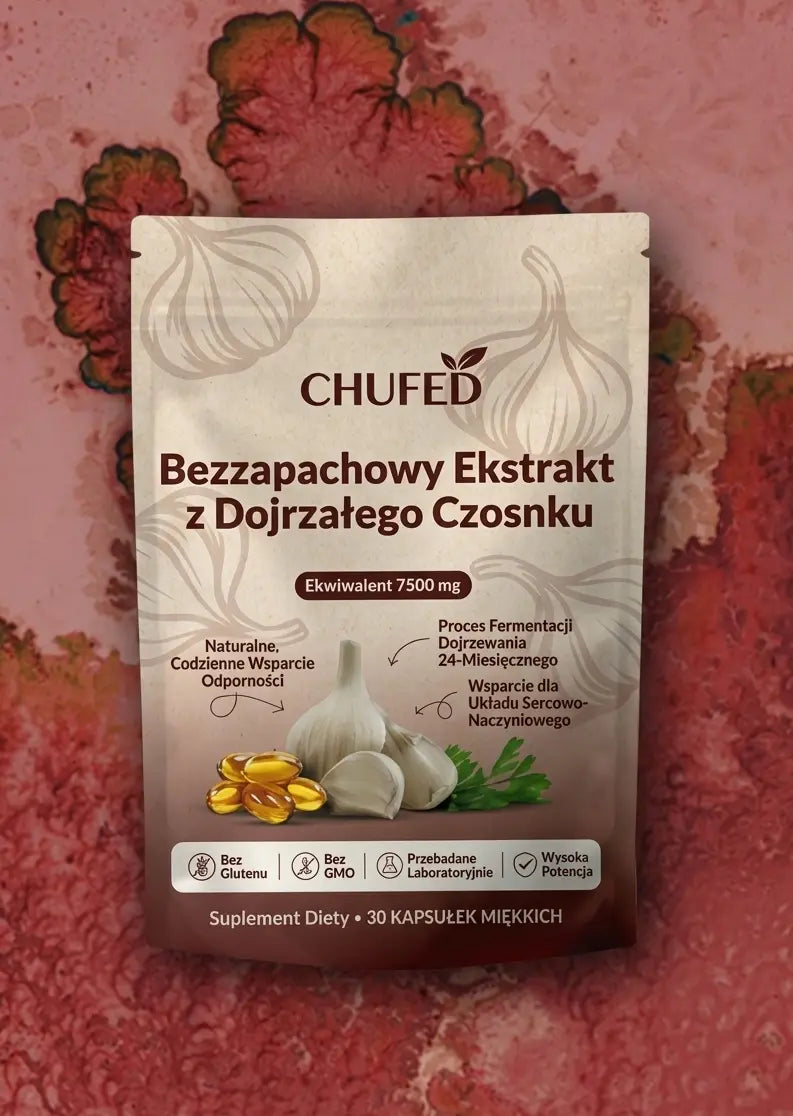 Świeży czosnek i zwykłe tabletki zawierają allicynę, która działa drażniąco na żołądek i ulega zniszczeniu pod wpływem kwasu żołądkowego – aż 85% tej substancji się marnuje. Nasz 24-miesięczny proces dojrzewania przekształca te niestabilne związki w biodostępną S-allilocysteinę, która jest 30 razy łagodniejsza i faktycznie się wchłania. Jedna kapsułka Chufed dostarcza równowartość 7500 mg dojrzałego czosnku – to większa moc wspierająca serce niż zjedzenie całej główki surowego czosnku, bez żadnych problemów trawiennych.