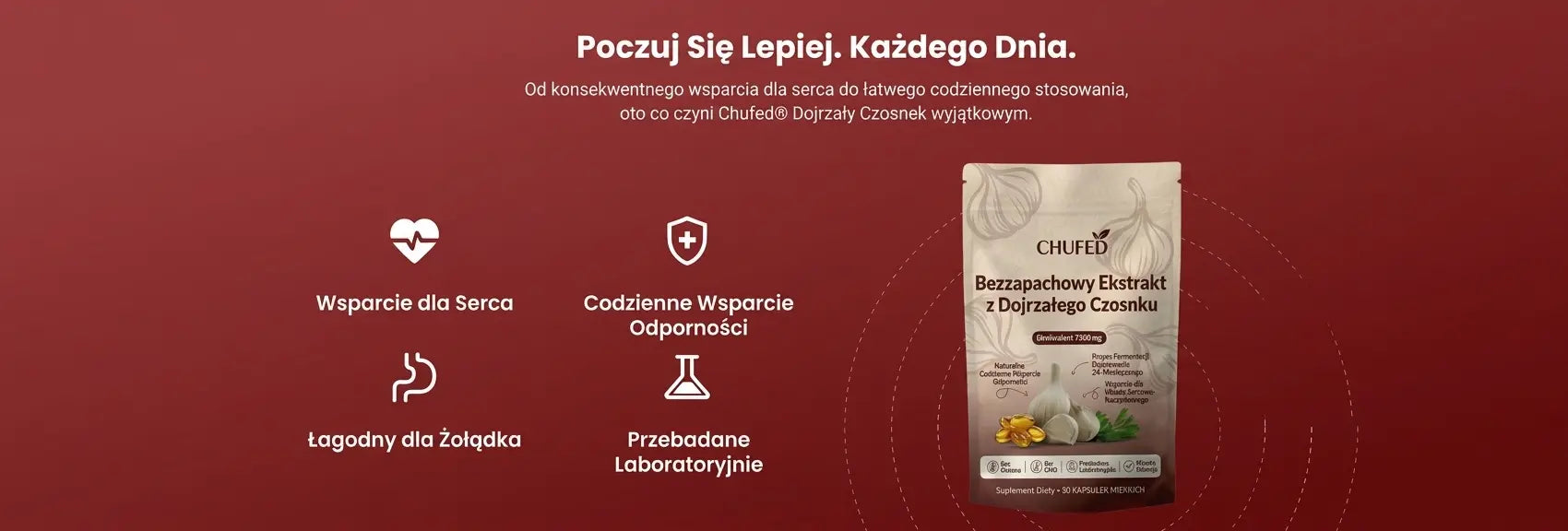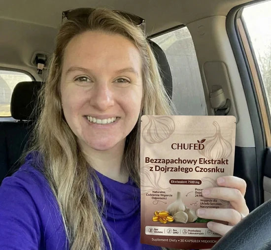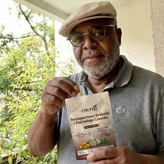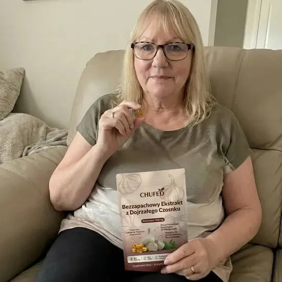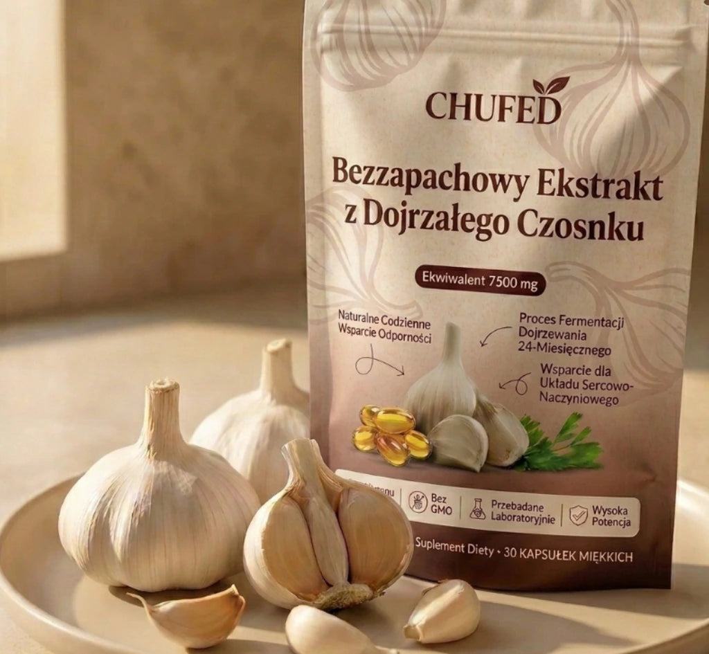 Ekstrakt z dojrzałego czosnku był przedmiotem licznych badań naukowych dotyczących odżywiania, skupiających się na zdrowiu serca i ogólnym samopoczuciu. Chufed zapewnia stałą dzienną dawkę w wygodnej formie kapsułek żelowych. Produkt stworzony z myślą o długotrwałym dobrym samopoczuciu, a nie o doraźnych efektach.